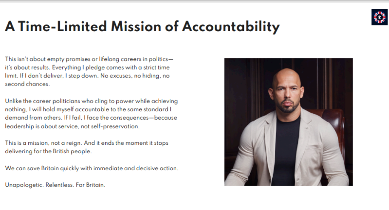 The BRUV Party's charter outlines a time-limited mission of accountability, with Tate promising to step down if he fails to implement changes within 45 days of being elected. Some of the party's proposed policies include harsher migration policies, a reduction in knife crime through stricter punishment, and a reform of the BBC. Tate has also mentioned investing in infrastructure and schools, prioritising the National Health Service (NHS) for British taxpayers and passport holders.
